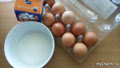 3 яйца,100 г сахара,200 г сливок 35%,2 столовые ложки муки и 50 г миндальных хлопьев.