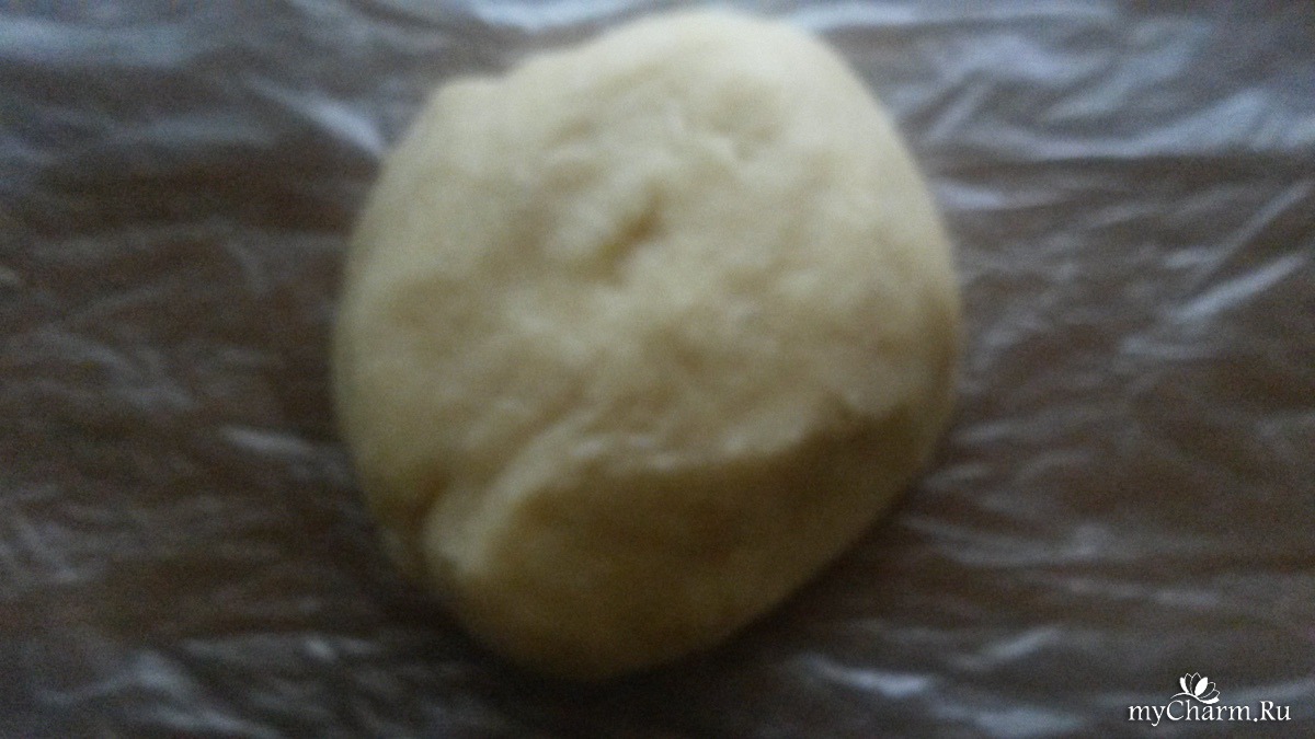 Замешиваете тесто, получается очень мягкое и выкладываете его в пленку, убираете на 30 минут в холодильник.