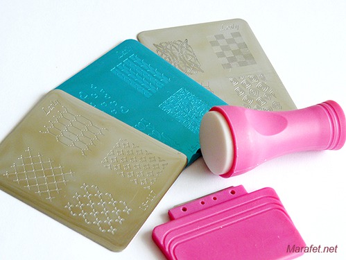Используются пластины с разными узорами, а затем переносят его на ноготь с помощью штампа: