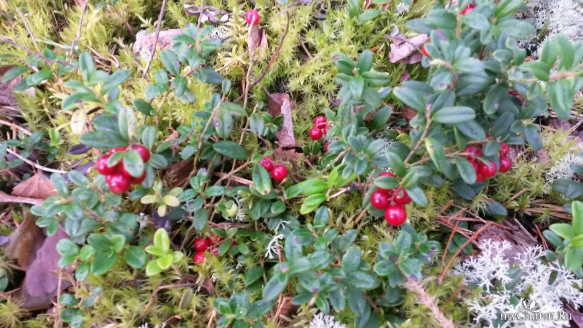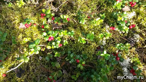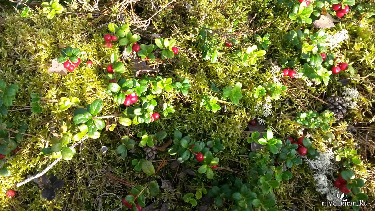 Мох белым, пушистым ковром обнимает этих красавиц, а вокруг уже полно брусники, она своими красными гроздьями раскидала по всему лесу эту красоту,
