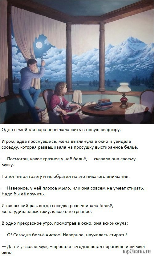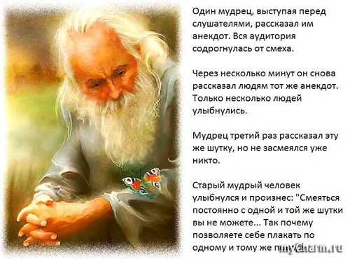 Здравствуйте, мои дорогие! Сегодня сеанс будет необычным. Не буду раскрывать всех секретов, но мне пришел вот такой ответ на мой вопрос: (Эта притча прислана мне одной девушкой, с таким же как у меня именем, и притча взята из Points of You (TM), о том, как часто мы говорим про одно и то же, но на разных языках, не понимая друг друга) Для вас будут притчи из других источников... Читать полностью |