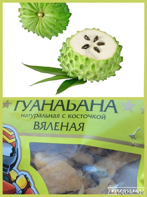 Гуанабана, а иначе говоря сметанное яблоко, представляет из себя зеленую дыню со светло-кремовой мякотью. В фирменный пакетик "Маркус Фастмувер" она попадает прямо с косточкой. По вкусу этот фрукт немного похож на ананас. Гуанабана имеет богатый витаминный состав, и её разумное употребление оказывает исключительно положительное влияние на организм! По некоторым проведённым исследованиям, известно, что фрукт имеет противораковые свойства, а экстракт гуанабаны является противовирусным и успокоительным средством.