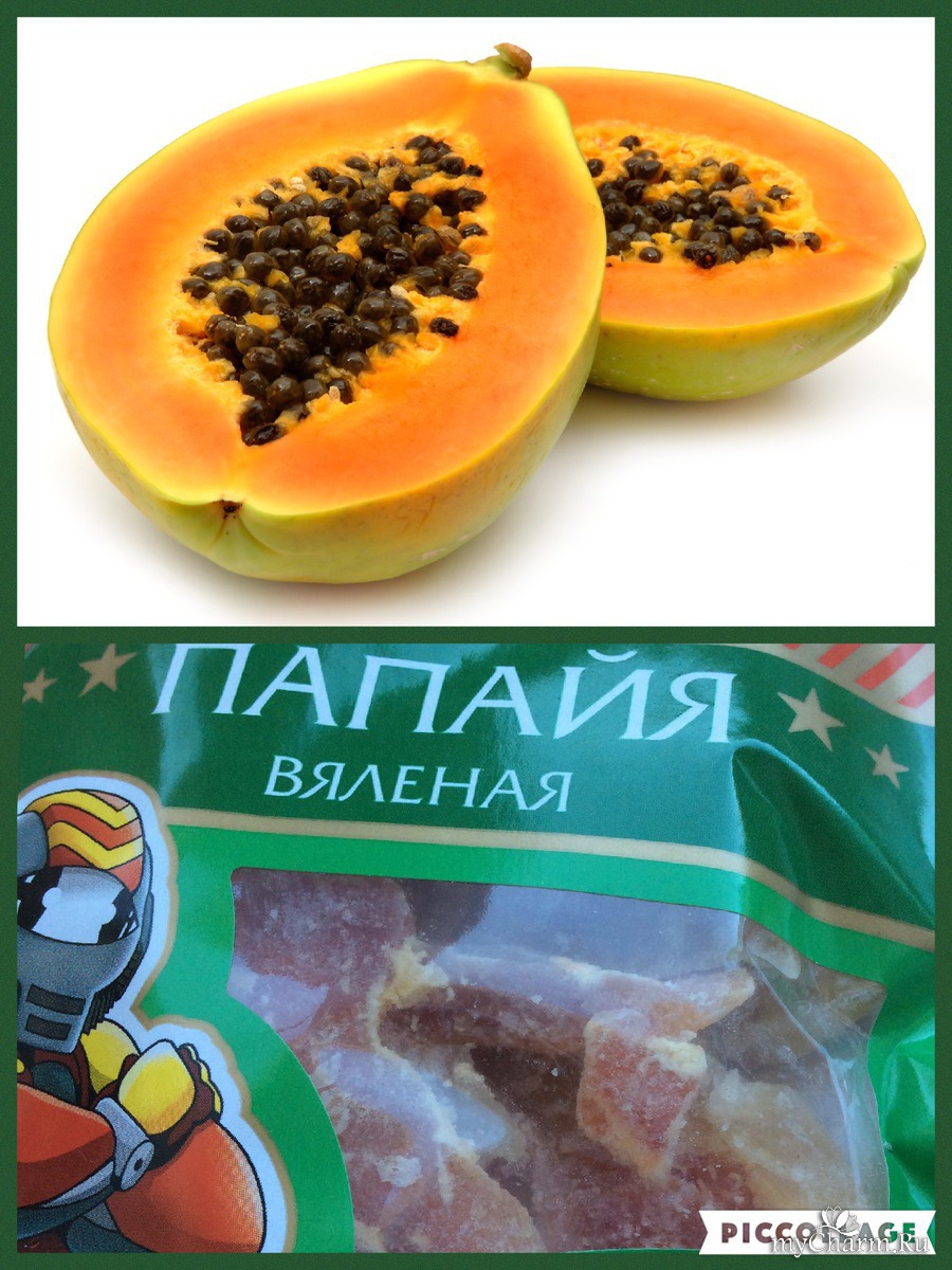 Папайя произрастает на невысоких деревьях, которые не имеют ветвей! Сам по себе этот фрукт богат углеводами, белками, клетчаткой, целым комплексом витаминов и минералов. При всём этом папайя является низкокалорийным продуктом! А это очень актуально для тех, кто следит за своей фигурой! Вяленая папайя ооочень сладкая, пожалуй, самая сладкая из всех 6 фруктов. Может, потому и быстро насыщает и отбивает желание съесть какую-либо вкусняшку