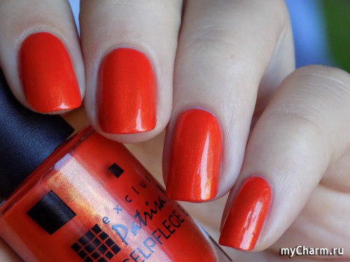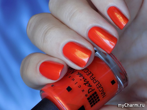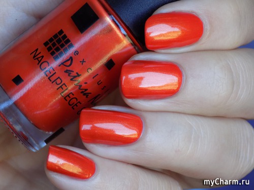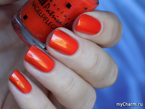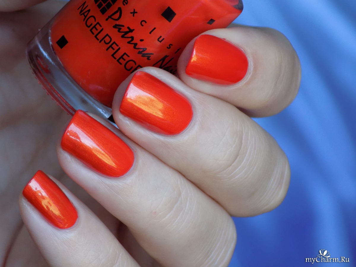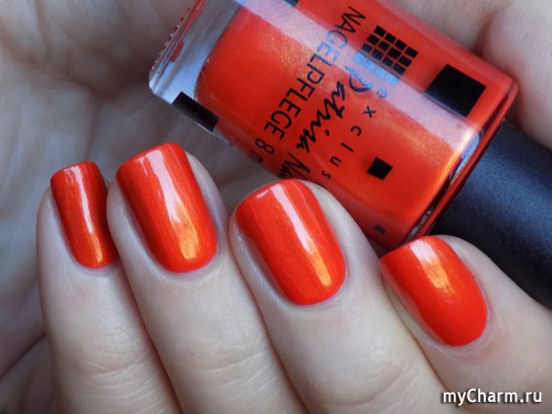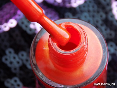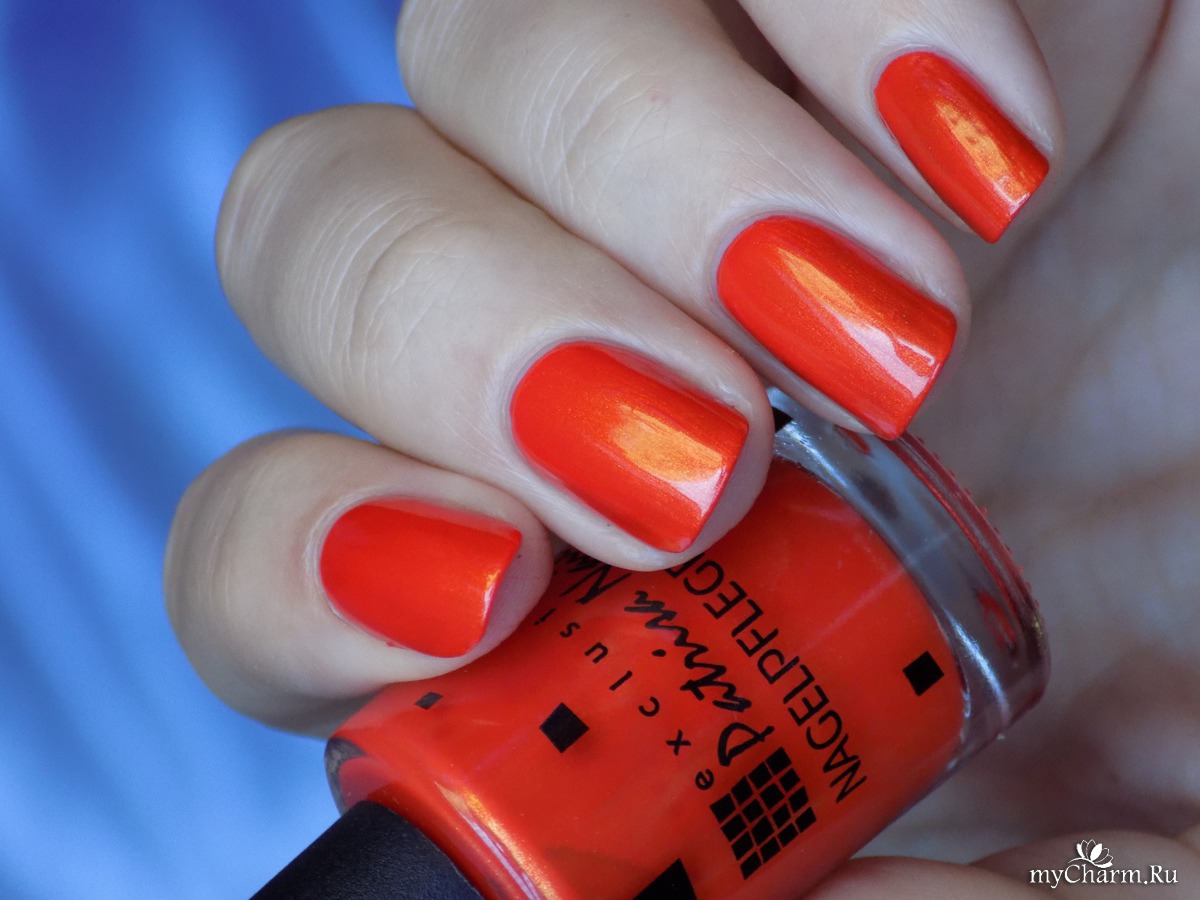Насыщенный оранжевый оттенок. Содержит в себе мельчайший золотой шиммер, который красиво подсвечивает лак изнутри. Нанесен в два тонких слоя. Не полосит при нанесении, не затекает под кутикулу, не требует топового покрытия.