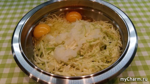 Кабачок с мягкой шкуркой, поэтому натираю на терке вместе с ней, не чищу. Так же натираю лук и добавляю парочку куриных яиц