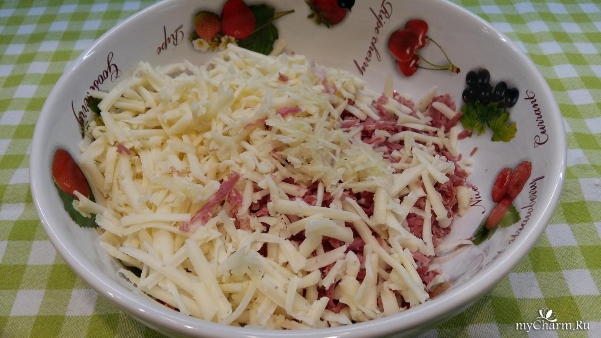 Теперь готовлю начинку, сегодня у меня натертая на терке варено-копченая колбаска и сыр, еще добавила зубчик чеснока. Начинка может быть любой на ваш вкус, обычный фарш с луком и зеленью, сыр с творогом, чесноком и зеленью и т. д.
