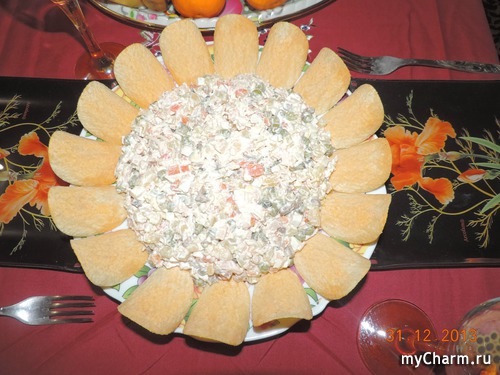 "первоклашка""подготовишка"а салат Оливье , вернее оформление по-моему вариация на тему салата "Подсолнух", мой хитрюга сын просил "накрошить" чтобы безнаказанно-много "обрывать" лепестки...