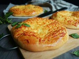 Тесто делим на 3 части. Каждую часть раскатать в небольшой круг, на серединку выложить горкой натертый Сулугуни ( 150 гр), защипать тесто в форме мешочка, перевернуть и раскатать скалкой в большой круг ( 15-20 см).