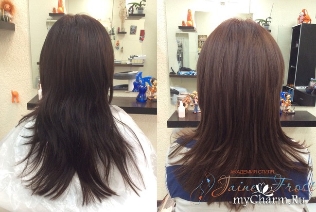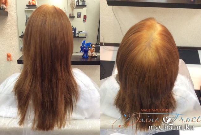 Следующим этапом стало окрашивание с применением ламинирования на уровне 6-ки. Получился очень красивый, насыщенный цвет корицы.