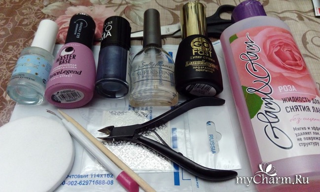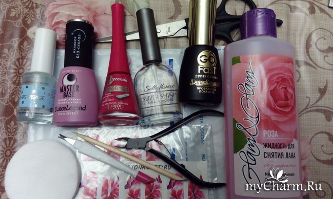 Слева-направо: средство для удаления кутикулы, топ-база, лак, верхнее покрытия для стойкости маникюра, сушка, жидкость для снятия лака, ну и всем известные и нужные вещи: щипчики для удаления заусенцев, ватные диски, абрикосовая палочка, ножницы и жемчужина маникюра - слайдер