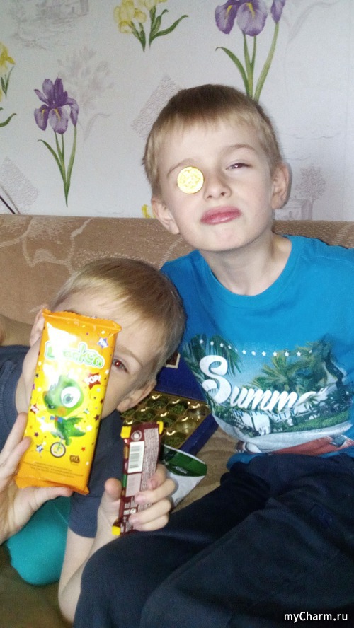 Мы получали пакет вместе с младшим сыном, я ему рассказала про шоколадные сюрпризы и он разумеется захотел посмотреть, что там внутри пакета, но так как мы ждали автобус, достали только жевательные конфетки.