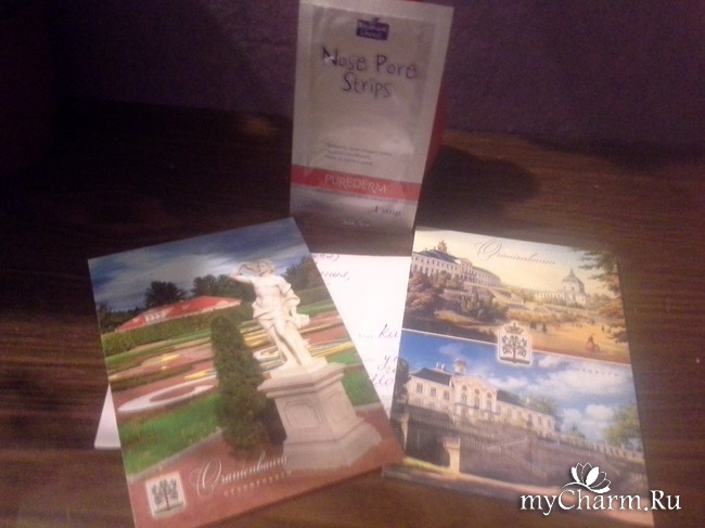 В конвертике лежали 2 потрясающие открытки, с теплыми пожеланиями и такая нужная очищающая полосочка для носа