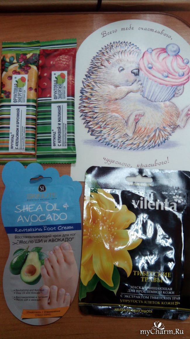 Первым был конвертик от Тани (Вечерка). Милая открытка с ежиком-сладкоежкой (таким же, как я), маска для лица, крем для ног и вкусняшки-фрутиладки.
