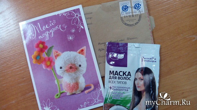 Второй привет – от Насти (Owlways). Красиво оформленный конвертик уже вызвал улыбку, еще не будучи открытым. Внутри лежала яркая открытка с котиком и маска для волос.