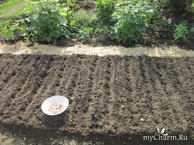 У нас земля рыхлая, расстояние между рядами начертила 15 см, глубина ямки где то 5 см. Посадила не применяя сил, чтоб был лучший сход и росту корешков.