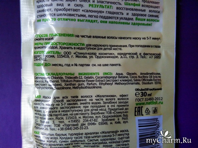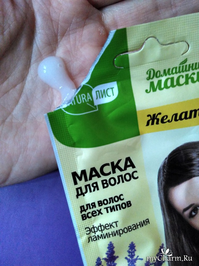 «Желатиновая» маска с «живыми экстрактами» клевера и шалфея, помимо укрепления волос, еще и обладает разглаживающим (ламинирующим) свойством. Многие женщины ламинируют волосы в домашних условиях, применяя самостоятельно намешанную желатиновую маску. А тут не нужно возиться с желатином, да и пользы для волос точно намного больше.