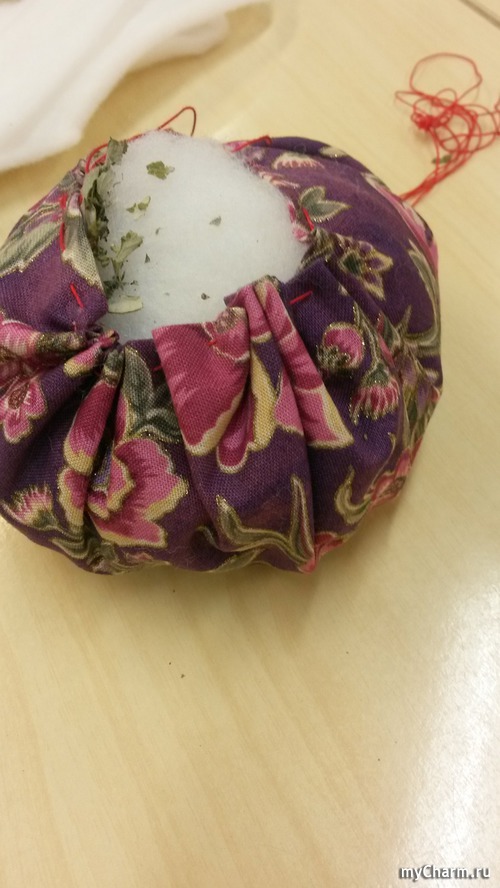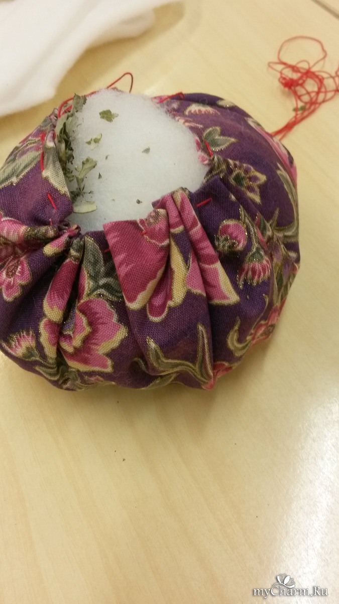 4. Сразу же можно заготовить мешочки с травой (солью). Берем маленькие лоскутки цветной ткани, наполняем каждый душистой травой и перевязываем их – это мешочки.