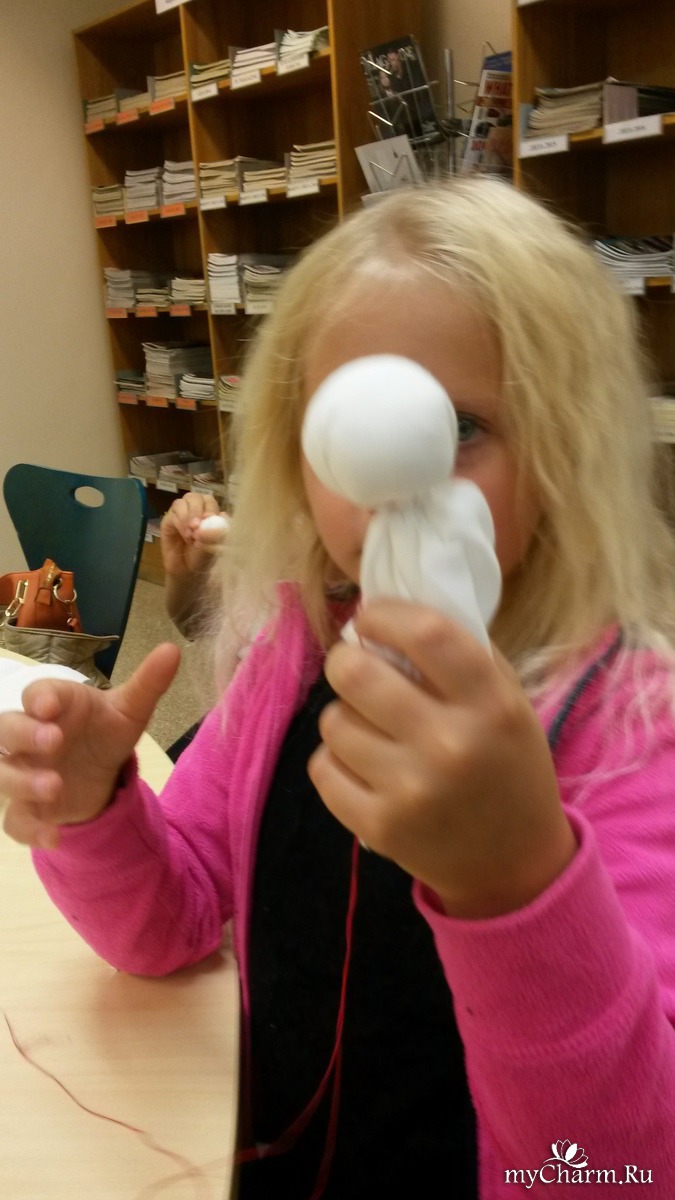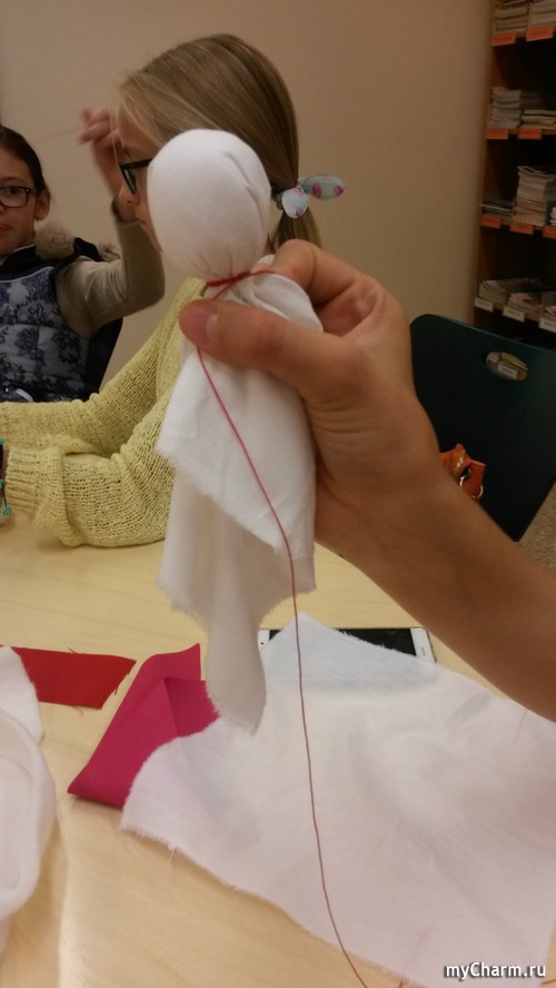 6. Делаем кукле голову, стараясь чтобы лицо было без складок. Для этого красной ниткой перевязываем на месте предполагаемой шеи четное количество витков, затем – два узла.