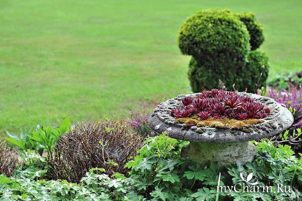 Но молодила хороши и в классических вазонах, и в каменных корытах, и в керамических горшках, даже в старых чемоданах, башмаках и в прочих винтажных «штучках».
