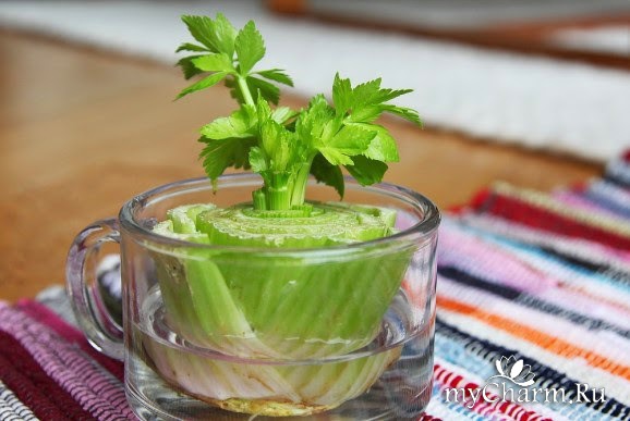 Отрежь основание сельдерея и помести его в блюдце с теплой водой на солнце. Листья начнут расти в середине основания, затем можно его пересадить.