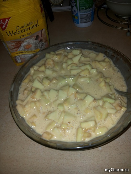 Я режу яблоки мелкими треугольничками. На большую форму беру 5 яиц и щепотку соли, разбиваю, как на омлет, до появления пены. Потом туда же пару ложек сахара (зависит от кислоты яблок и собственнных предпочтений, можно и стакан насыпать), дальше взбиваю до растворения, потом пару столовых ложек муки и взбиваю дальше до исчезновения комочков (муки можно больше или меньше, главное, чтобы тесто было как густая сметана). Если есть что-то кисломолочное, то можно дать не больше полстакана, тогда уж и пекарский порошок или разрыхлитель, а затем снова мукой отрегулировать консистенцию. Яблоки кинуть в эту смесь и перемешать всё вместе. Вот так: