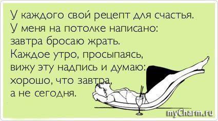 Дорогие девочки! Неделя быстро пролетела и хочу на выходные поднять вам настроение! Худеем весело, дорогие! Марина села на диету — Легла на пол, качает пресс, Скрипя зубами, приседает — На море ехать через час. x x x x x Девочки, которые предлагают быстрый способ похудения, не надо звать меня дружить! Мне совершенно неинтересно, как вы в свои 23 года похудели на 40 кг... Читать полностью |