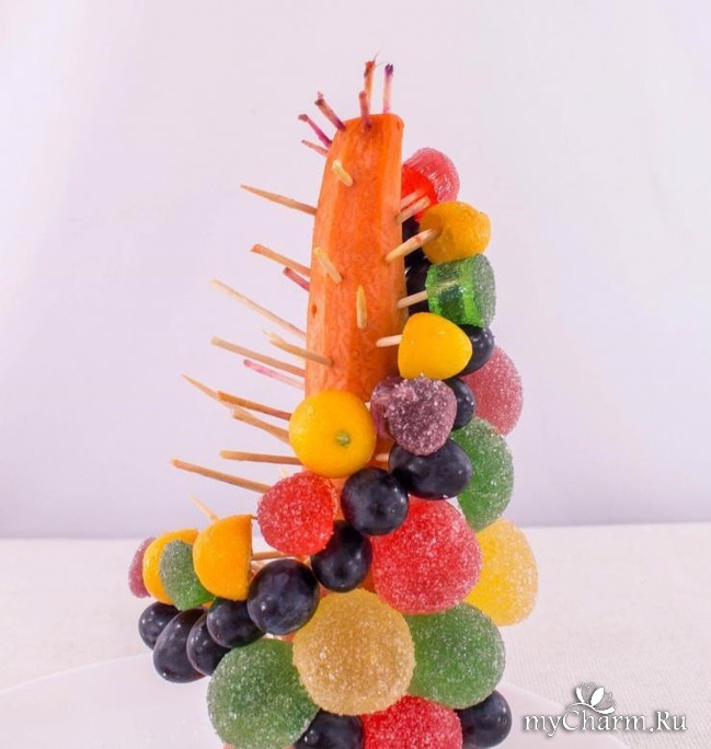 Кумкват (от кит. золотой апельсин) – желто-оранжевый тропический фрукт семейства цитрусовых вечнозеленого растения. Этот плод имеет и другие названия – кинкан и фортунелла. Внешне кумкват похож на очень маленький овальный апельсин. По длине он достигает максимум 5 см, а в ширину – 4 см. В употребление фрукт идет полностью вместе с кожурой. Вкус плода очень близок к кисловатому мандарину, но при этом кожура имеет сладко-терпкий привкус. Родиной кумквата является южная часть Китая.Всё очень просто. Основой для елки служит морковь, которая вставлена в половинку яблока для устойчивости. Все ингредиенты крепятся к моркови на зубочистках. Обламывайте их до нужной длины.