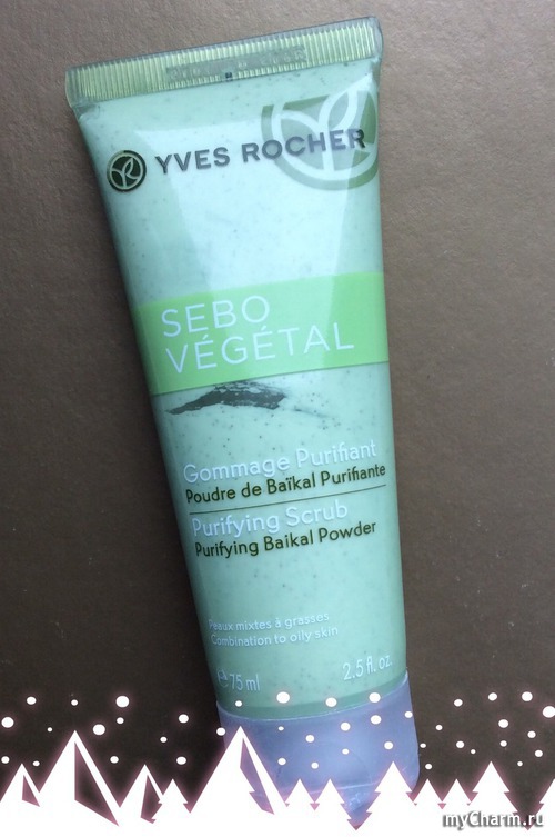 Для более же глубокого очищения и обновления кожи лица я использую скраб. Сейчас это гоммаж от Ив Роше из полюбившейся мне серии Sebo Vegetal. Пудра Байкальского шлемника, входящая в его состав восстанавливает естественный баланс кожи, а экстракт растительной пудры матирует и регулирует выработку кожного жира.