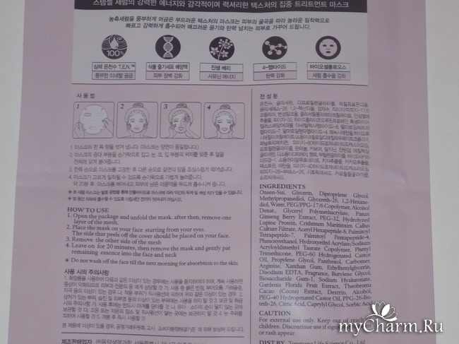 Кожа после применения маски нежная, бархатистая. Конечно, маска не содержит никаких силиконов и парабенов. Потому применять ее можно при любом типе кожи и в любом ее состоянии. Умываться после применения маски, которое нужно производить по инструкции на упаковке, совершенно не нужно! Достаточно влагу, которая останется на лице, аккуратно вмассировать в кожу, вбить кончиками пальцев. Я наношу оставшуюся влагу из пакетика с маской еще и на шею)).