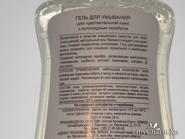 Данный гель для умывания «Зеленый Алтай» с коллоидным серебром предназначается для чувствительной кожи. У геля приятный аромат. Цвет, как видите, прозрачный совершенно. Гель густой, хорошо распределяется по коже, мягко пенится. Вообще, его следует применять не только для чувствительного типа кожи, но и для жирной, комбинированной, нормальной. Гель после умывания им не сушит кожу, хорошо ее разглаживает. Кроме того, он содержит коллоидное серебро. А это, как мы знаем, отменный антисептик, защищающий кожу от воспалений и активирующий обновление клеток кожи.