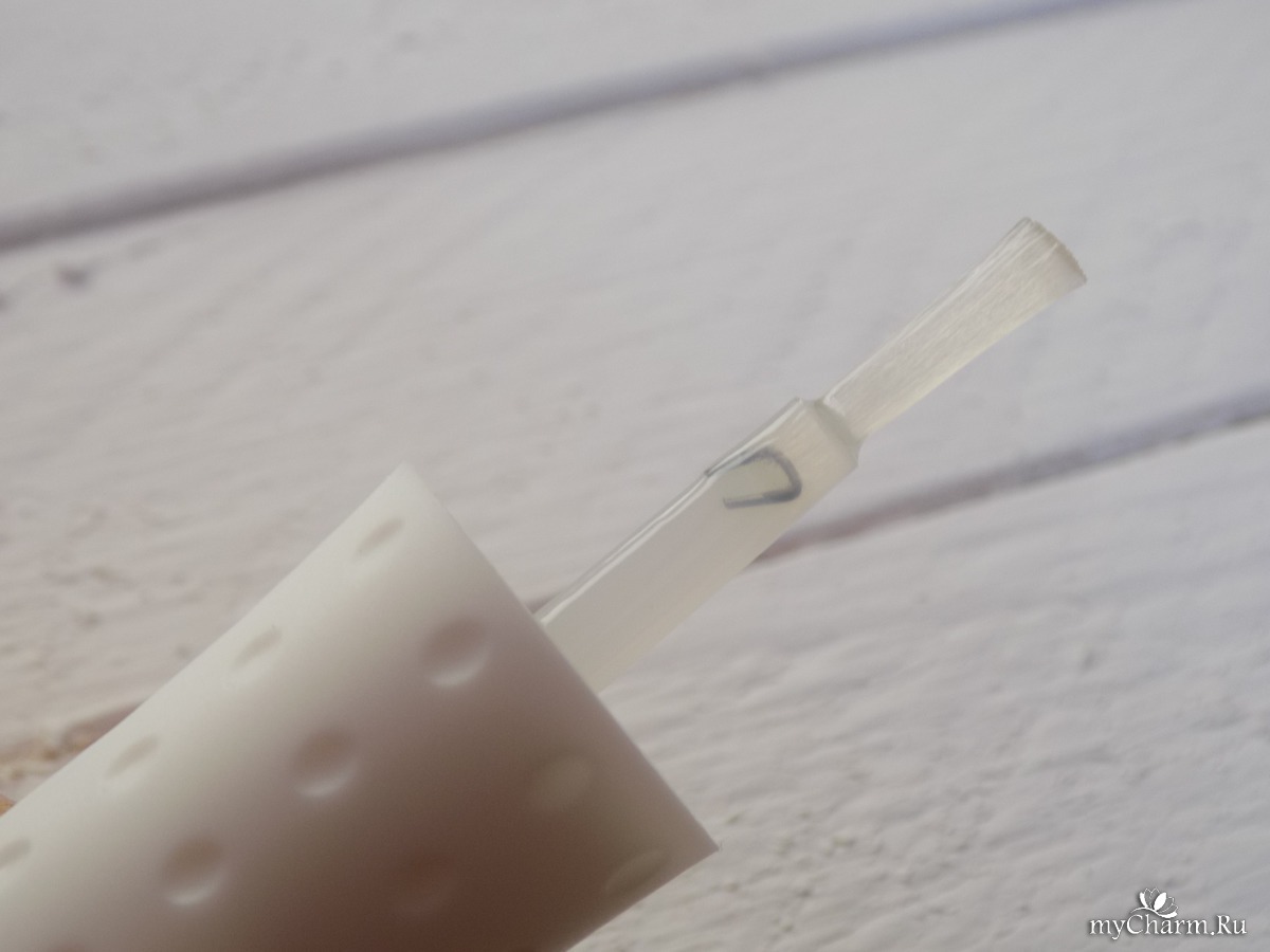Средство оснащено удобной широкой плоской кистью, которая позволяет покрыть ногтевую пластину буквально в два взмаха руки.