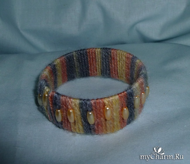 5. Браслеты из пластиковых бутылок. Отрезали от бутылки от шампуня и от воды нужной ширины кольца, края зашлифовали. Обкрутили пряжей. На один клубок заранее нанизали бусины. Хвостики ниток спрятали внутри обкрутки.