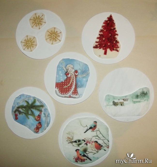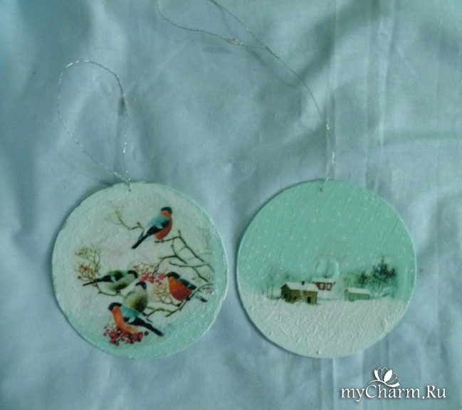 1. На подготовленные cd-диски наклеили клеем ПВА фрагменты из декупажных карт и салфеток новогодней тематики. Отверстие в диске зашпатлевано и все покрашено акриловой белой краской на 2 раза. До покраски дрелью выпилили небольшое отверстие для подвешивания.