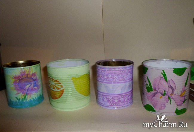 7. Органайзеры из жестяных баночек. Отмытые баночки покрасили акриловым красками разных цветов, наклеили салфеточные мотивы, просушили, покрыли акриловым лаком. Кое-где затонировали. Можно использовать для хранения ручек, карандашей, косметических принадлежностей.