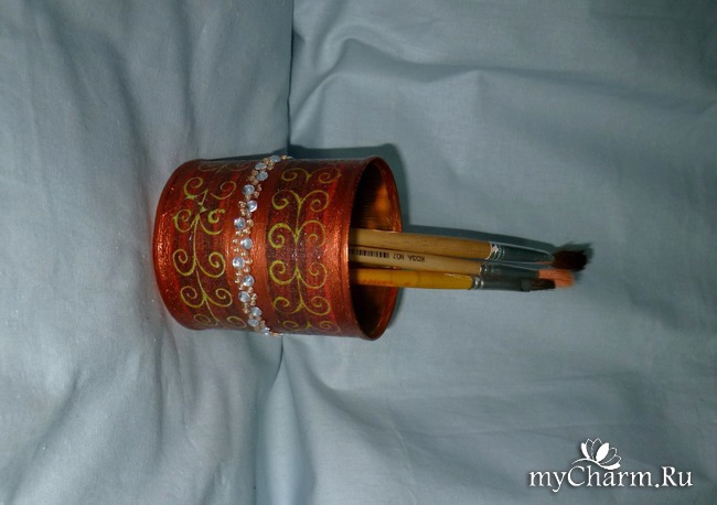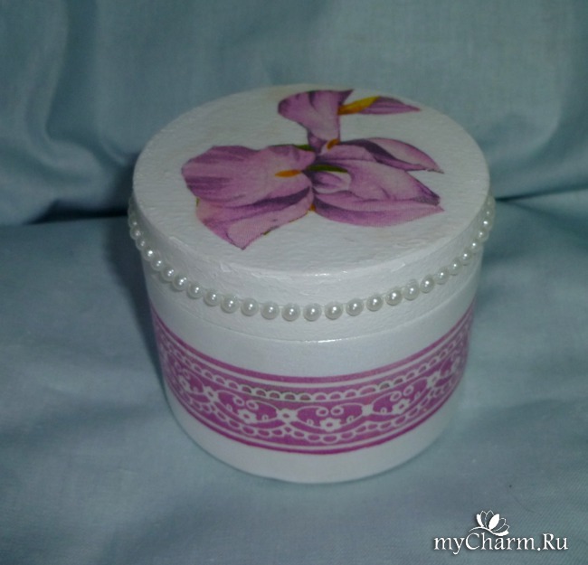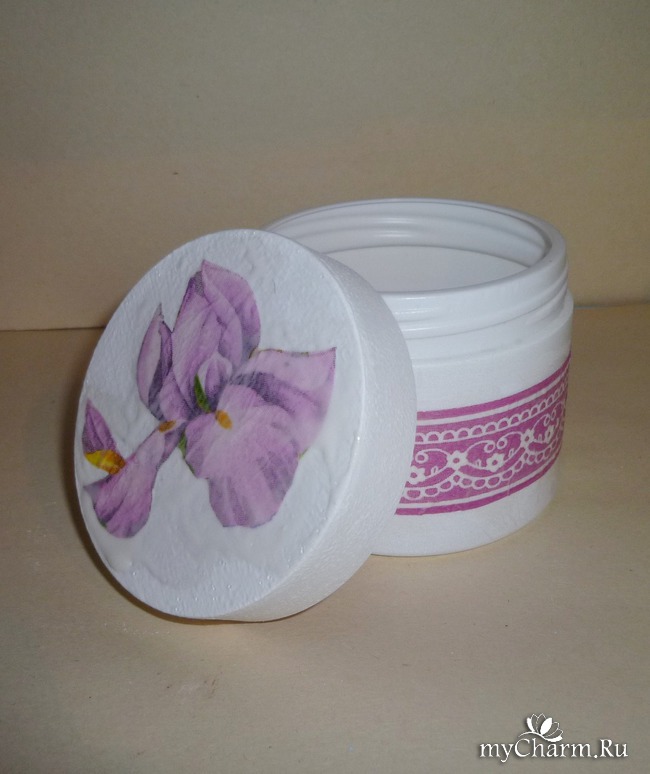 3. Шкатулка. Была это баночка кажется от маски для волос. На обезжиренную поверхность наклеили фрагменты салфеток, высушили, здесь даже не красили, потому что баночка белая, покрыли акриловым лаком и украсили полубусинами на ленте (такие бывают для украшения сотовых телефонов, ещё есть блестящие разных цветов)