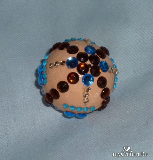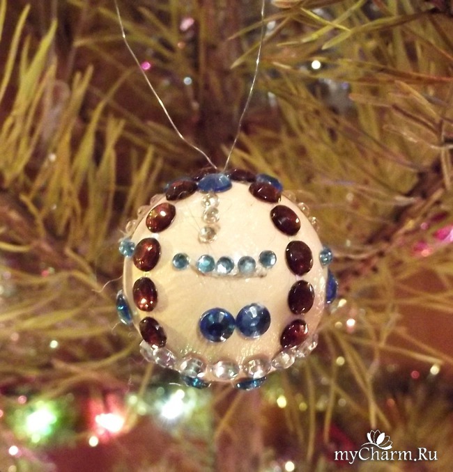 8. Елочная игрушка. Шарик отмыли, обезжирили, просверлили отверстие сверху для подвешивания, покрыли краской акриловой на два раза, затем лаком, украсили стразами. Продели проволочку. Но лучше это делать до покраски.