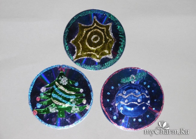 2. Тоже CD-диски, но технология попроще. Отверстие заклеили вырезанным по диаметру кружком картона. Из блестящей самоклейки вырезали круг, приклеили на диск, на вторую сторону диска - блестящую - аппликацию, украсили глиттером.