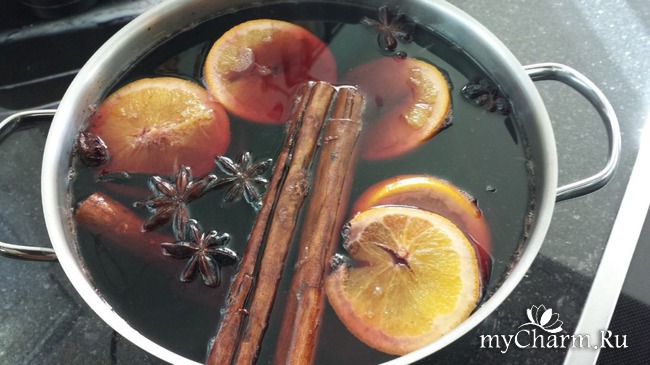 По немецки Gluhwein (глювайн), происходит от gluhender Wein — горячее вино. В глинтвейн добавляют корицу, гвоздику, лимонную корку, бадьян, мёд, кардамон. Я всегда ложу ещё дольку апельсина в готовый напиток.