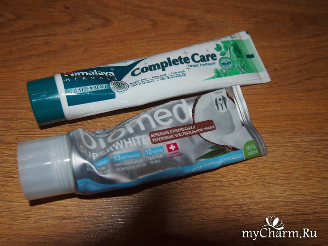 По совету врача мы пользуемся несколькими пастами. Утром — это отбеливание от Biomed, вечером — паста, направленная на уход от Himalaya.