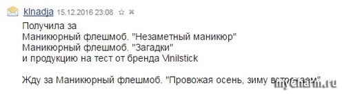 Друзья, всем доброго дня! У меня будет к вам огромная просьба . Девочки, которые получают продукцию на тестирование в сообществе маникюр/педикюр. Отмечайте пожалуйста, получение здесь, в комментариях под этим постом Так как многие забывают это делать, а я потом переживаю, получена ли Вами посылочка. Вас много, а я одна и стучаться к каждому в личку, мне не очень удобно... Читать полностью |
