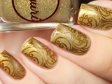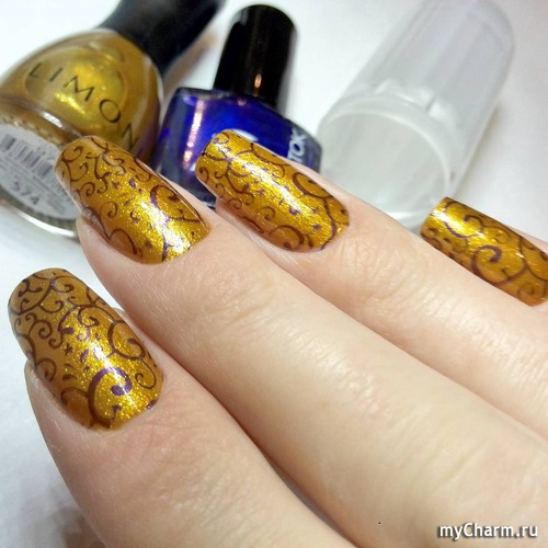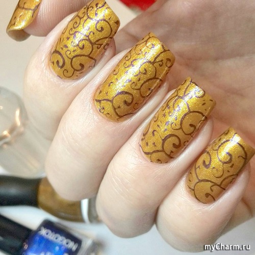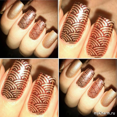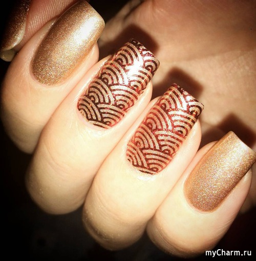 Попробуйте несколько раз произнести и быстро-быстро название этого вида «золотого» маникюра. Получилось? Тогда у вас, несомненно, получится и сам нейл-рисунок, напоминающий морозец на окнах. В самый раз в таком варианте будут выглядеть на золотистом фоне оттенки бронзового лака и коричневого.