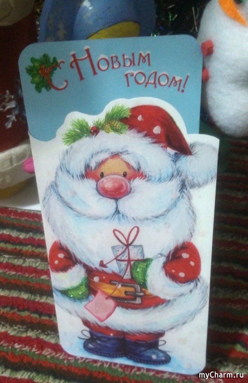 Вот такая чудесная открытка с очень милым, трогательным Дедом Морозом. И с чудесным поздравлением.