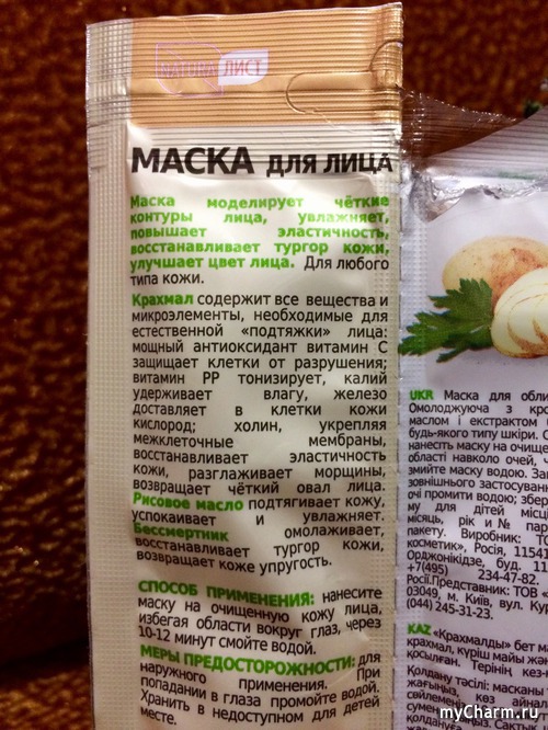 Крахмал, который содержит необходимые вещества и микроэлементы, необходимые для естественной 'подтяжки" лица; мощный антиоксидант витамин C защищает клетки от разрушения; витамин PP тонизирует; калий удерживает влагу; железо доставляет в клетки кожи кислород; холин укрепляет межклеточные мембраны, восстанавливает эластичность кожи, разлаживает морщины, возвращает четкий овал лица.