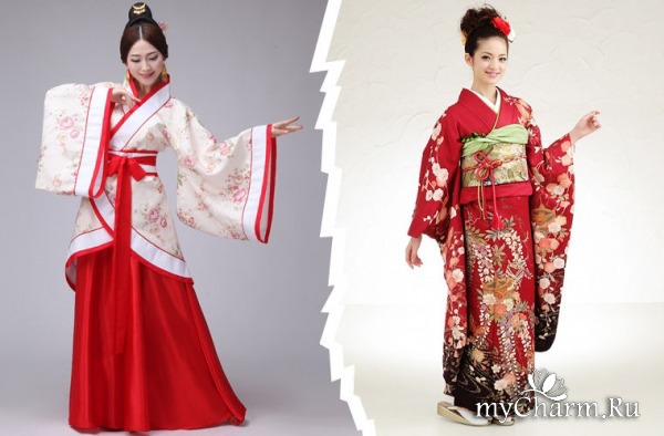 Традиционное китайское платье называется ханьфу (одежда династии Хань, III век до н. э.). Представляет собой набор одежды — от белья до запашного халата с поясом. Носили ханьфу и мужчины, и женщины. Вычурное и даже роскошное, оно демонстрировало все великолепие знаменитых шелковых тканей. После захвата власти маньчжурами в XVII веке на смену традиционной китайской одежде пришли чаншань у мужчин и ципао (платье из флага) у женщин. Они задержались на три столетия, пока Мао не переодел всех в униформу. Впрочем, сейчас ношение национальной одежды в Китае возрождается. В целом китайские костюмы выглядят ярче, вычурней и затейливей, нежели японские. Хотя основой для кимоно послужило именно ханьфу.