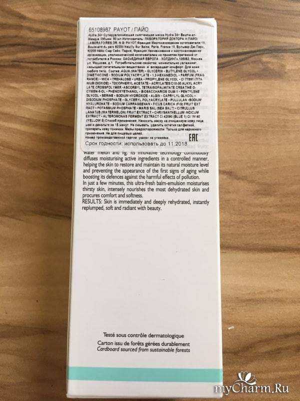 Первый продукт, на который я положила глаз, - это маска Payot HYDRA 24+ BAUME-EN-MASQUE. Эта маска – смягчающая и суперувлажняющая. Стоит сделать ее – и о сухости и стягивании можно забыть на весь день. Меня особенно порадовало, что маску не нужно смывать, потому что вода снова сделает свое злое дело, вызвав сухость. Тут этого можно не опасаться. Остатки нужно просто промокнуть.