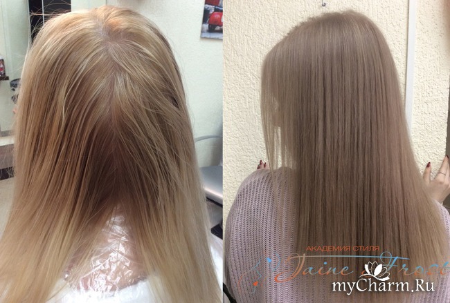 Я делала коктейль, так как там было до этого окрашивание и мелирование, и мне нужно было выровнять полотно волос))