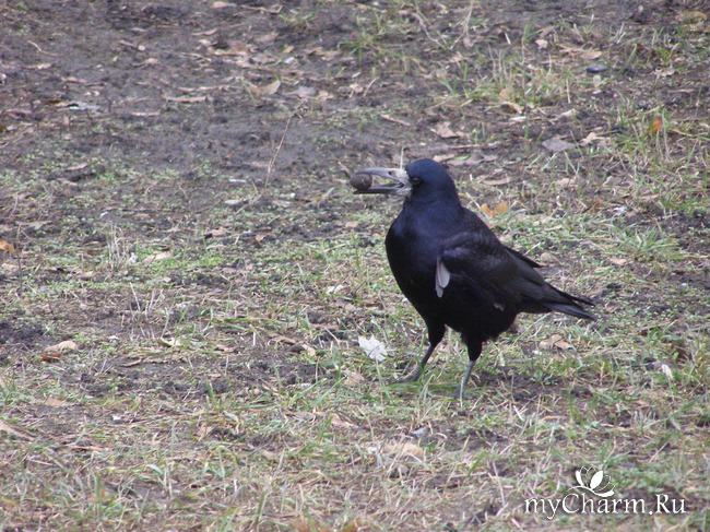 Осенний погожий день. Идем с дочкой по тихой улочке и слышим, что-то с высоты падает на дорогу перед самой машиной. Как только авто удаляется, подлетает черная птица и хватает нечто клювом. Когда подобное действие стало повторяться неоднократно, мы поняли, что сообразительная крылатая бестия таким образом раскалывала особо твердые орехи. Сначала она просто бросала их о дорожное полотно, но когда добыча не раскрывалась, то терпеливо ждала момента, чтобы проезжающий транспорт помог ей добыть желаемое. Чем она с успехом и пользовалась.