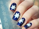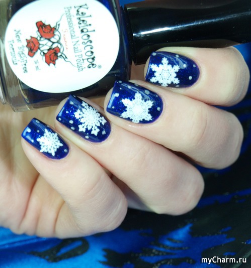 Для основы я взяла лак от El Corazon Ночные грезы - Козерог. Когда основа высохла, я вырезала нужные мне снежинки и прилепила их на ногти. Дотсом доставила точек для завершения дизайна. Получившийся дизайн покрыла топом. Сначала переживала и думала, что могут возникнуть проблемы с нанесением топа и придется прибегать к разным хитростям, чтобы избежать смазывание рисунка. Но мои опасения, к счастью, не подтвердились. Слайдеры повели себя лучшим образом.