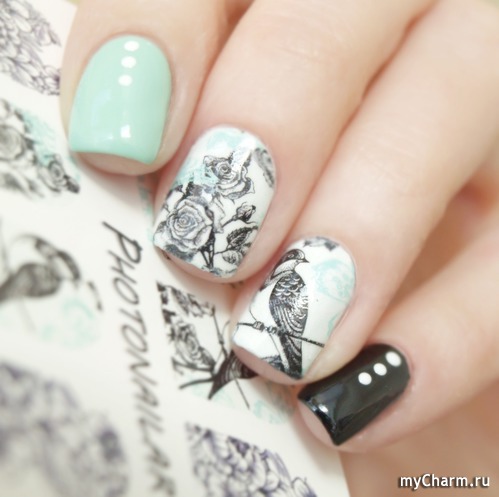 Для дизайна я выбрала лаки мятного и черного цвета. Слайдеры нанесла на безымянный и средний пальцы. Вот такой нежный и изящный маникюр у меня получился в итоге.
