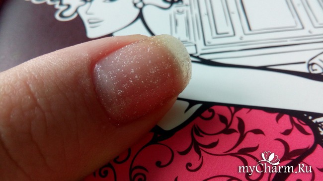 Кисточка достаточно широкая и ровная по всей длине. Красить ею ногти - одно удовольствие. Наносится лак хорошо, ложится красиво и ровно, распределяются "сахаринки" равномерно. Я наношу один слой лака, мне этого достаточно. На ногтях лак бесцветный, ощущается и видится шероховатость - тот самый сахарный эффект, который держится на ногтях около 3 дней. Затем "сахаринки" осыпаются, стираются - и на ногтях остается только переливающийся блеск. Смотрится красиво и интересно.